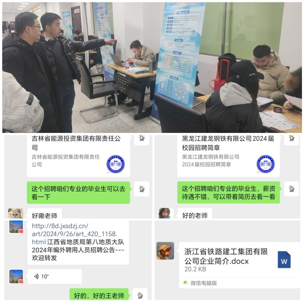 拓宽就业渠道,满足毕业生多元化求职需求。公司积极开展“访企拓岗促就业”专项行动,拓宽就业渠道、提供更多更优岗位,经理、副经理、系主任利用假期深入企业进行访企拓岗,为毕业生提供就业岗位20余个,成功签约4人;公司立足春招进校企业,党委书记、副书记及就业辅导员深入招聘现场,与企业对接并展开了深入的供需交流;公司依托员工资源,为毕业生提供有针对性的岗位信息,并发动全院教师在开展科研工作时,向科研单位推荐毕业生,形成了全员促就业的强大合力,形成了“守好一段渠,种好责任田”的生动局面。