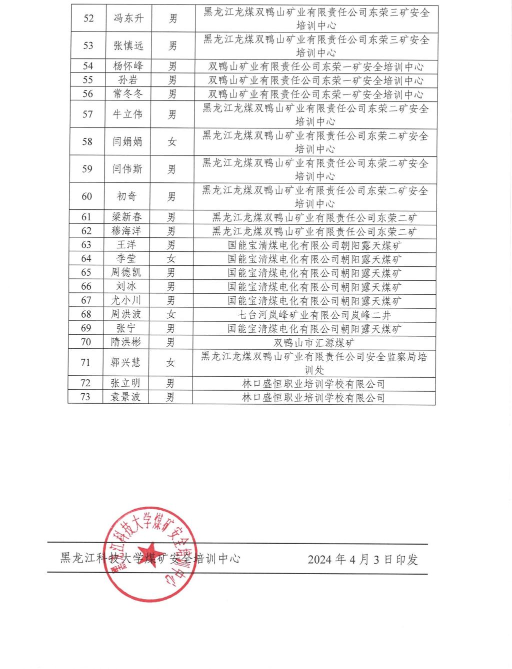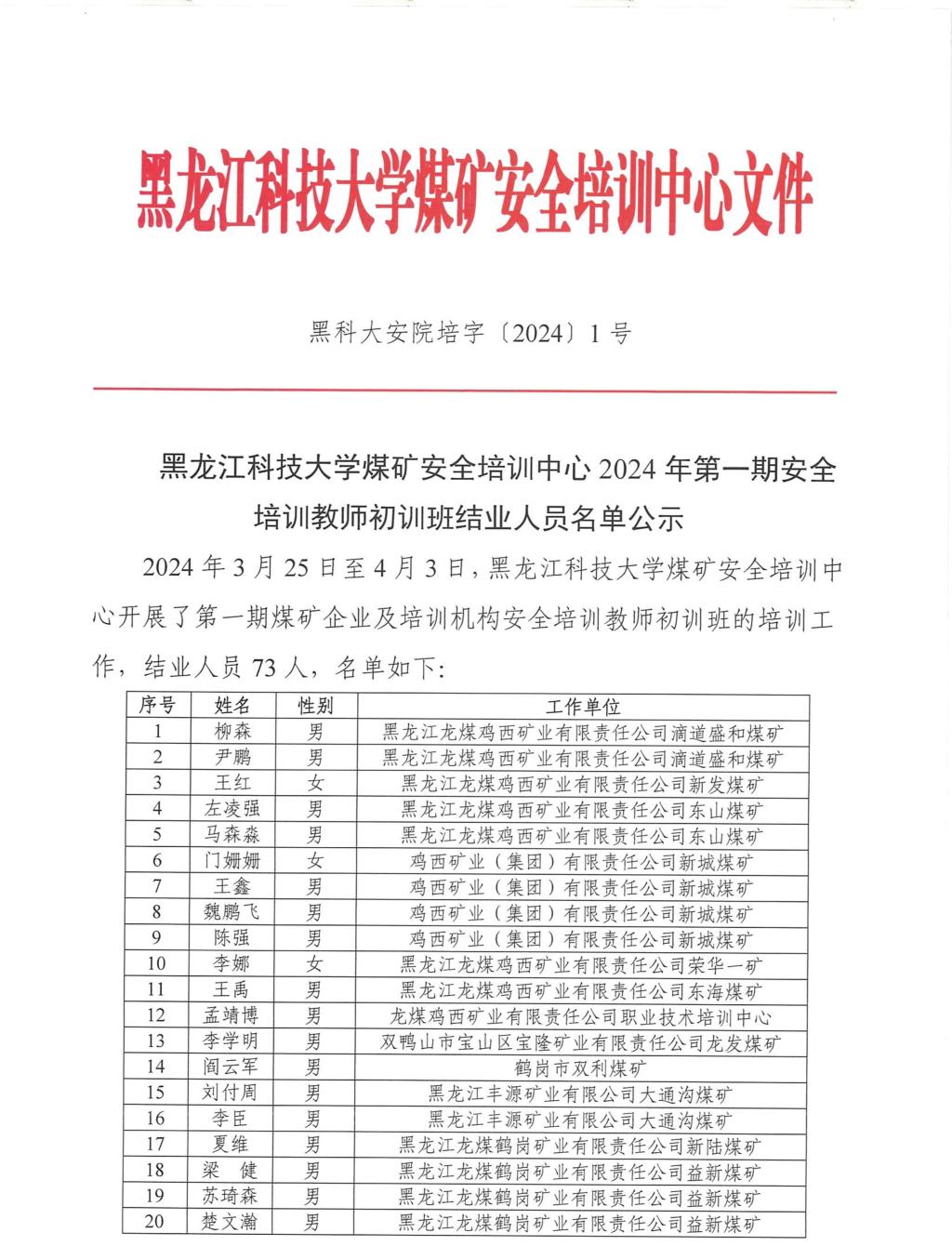3377体育手机平台煤矿安全培训中心2024年第一期安全培训教师初训班结业人员名单公示