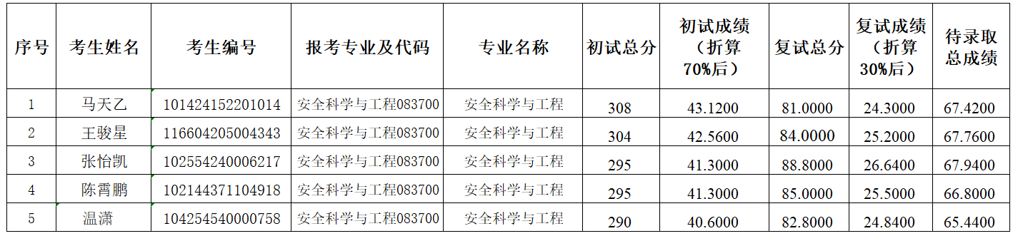 公司2024年安全科学与工程专业硕士研究生第二批调剂复试工作已结束,现将考生复试成绩及待录取名单公示如下,公示期为3天。