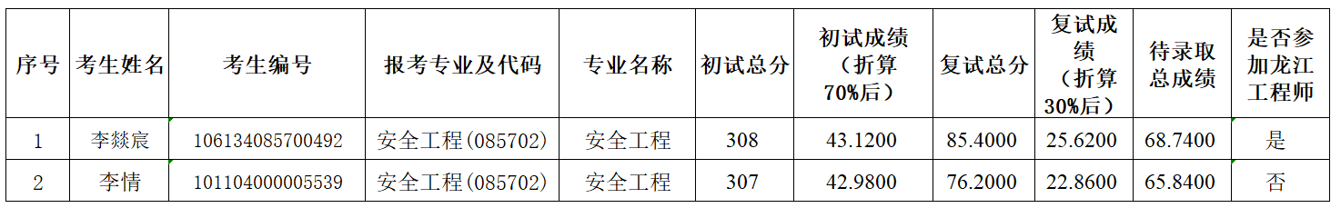 公司2024年安全工程专业硕士研究生第二批调剂复试工作已结束,现将考生复试成绩及待录取名单公示如下,公示期为3天。