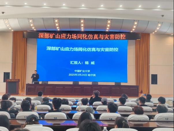 报告会上,杨威教授结合我国煤矿瓦斯灾害防控现状,从全矿井应力场数字孪生及巷道稳定性分析、应力集中规避防突技术、高应力煤巷条带“控制压裂”均匀卸压增透防突技术、采面“爆破+注水”气液两相接力式应力集中驱移防突技术、活性剂改性煤体五个方面详细介绍了深部矿山应力场同化仿真与灾害防控,同时指出我国灾害防突目前存在的问题,对师生了解煤矿灾害防控具有极大的指导意义。